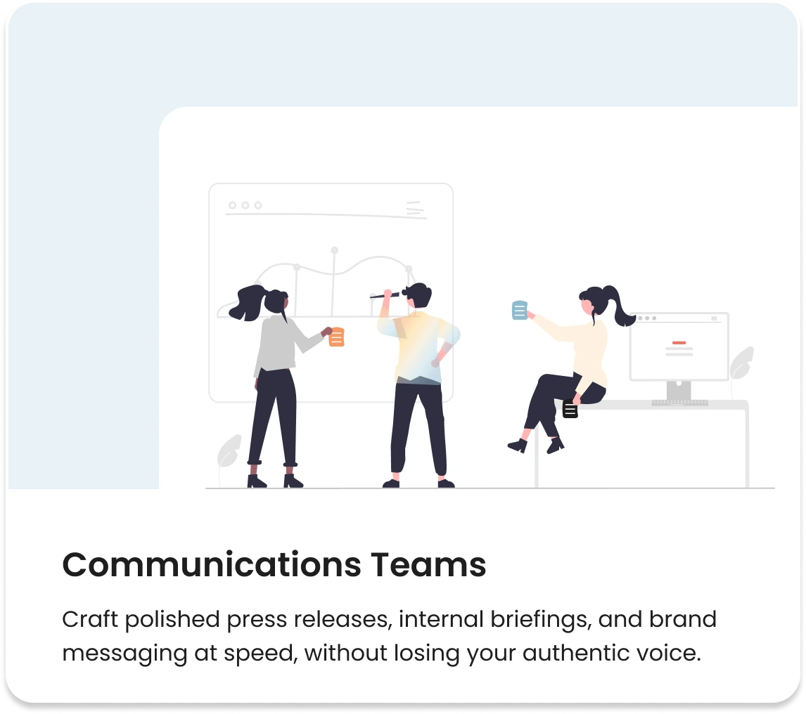 Craft press releases, internal briefings, and comms strategies in minutes — not hours. luminie helps you move faster, stay on-message, and elevate every word.